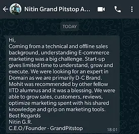 “Mohit understands different aspects of marketing, be it digital, performance, offline, branding; that's a very rare skill to have. He gets into a lot of details. Level of sincerity & professionalism is beyond doubt.”